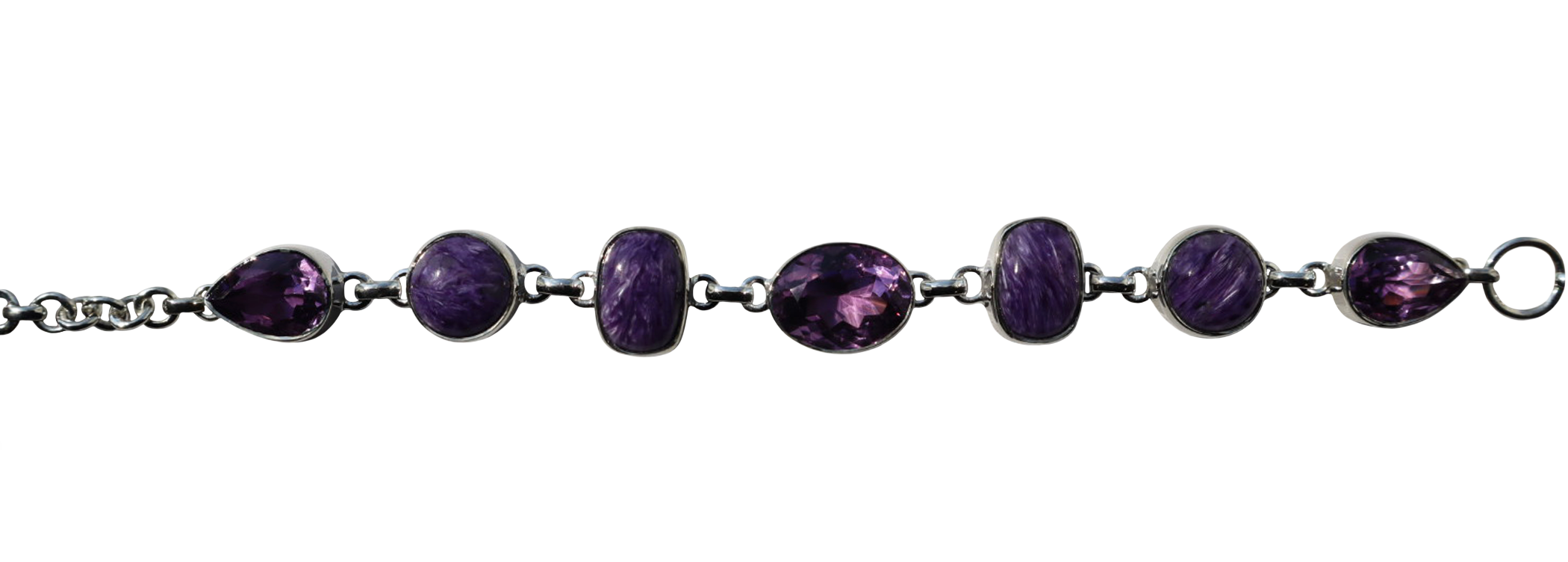 6″ Charoite and Amethyst bracelet set in sterling silver with a 3″ extender.