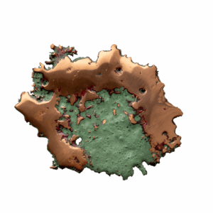 Splash Copper is created when molten copper is splashed onto a flat surface, where it cools and forms in organic, free form shapes. When it has fully cooled, a chemical patina is applied which turns the copper into a turquoise color. Then, sections are buff polished to remove the patina and reveal the glowing copper beneath before finally being sealed to preserve the two contrasting colors. This copper is native copper from Keweenaw, MI.